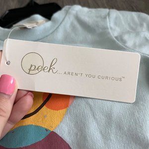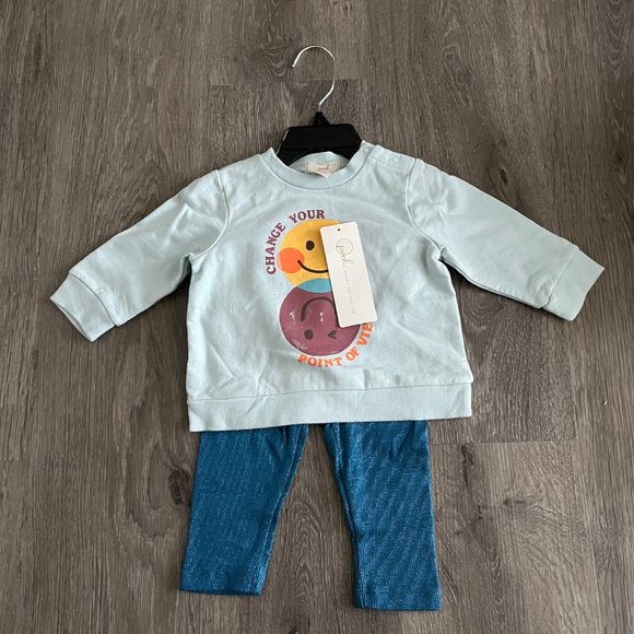 New with tags and hanger PEEK ESSENTIALS Change Your Point Of View Graphic Sweatshirt & Leggings Set In Light Blue. Sold at Nordstrom. Size 3-6 months. Graphic is on the front and back of sweatshirt. Graphic is purposely distressed. Leggings are dark blue with glitter. Super cute set! Condition: New With Tags