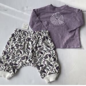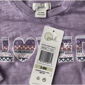 New with tags Peek two piece outfit. Purple long sleeve shirt with fair isle LOVED graphic and patterned harem style jogger pants. There is a heart graphic on the back of the shirt, perfect for Valentine's Day! Size 3-6 months.