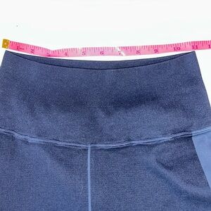 Chic dark blue leggings with geometric design. Features Peloton branding. Ideal for fitness enthusiasts.