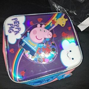 New with Tags- Missing strap- Has tags and never used from Overstock Items. ADORABLE Purple Peppa Pig with fun Confetti front and pocket inside. Has top handle but NO strap. Acrylic Top for easy cleaning. BPA Free. 9.5 inches Long 9 inches tall and appx 3 inches wide