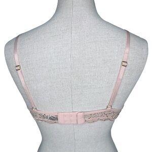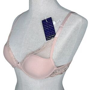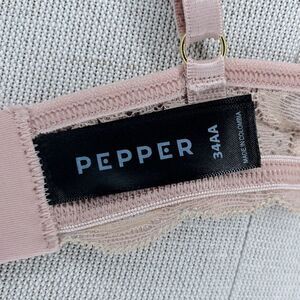 Women's Pepper brand Laidback Lace Bra, size 34AA. New with tags! Colorway is Sienna (Sienna Rose, a soft pink shade). Lined cup for no show-through, with mesh overlay. Lace trim along top edges of cups, lace band. Back closure has three rows of two hooks.