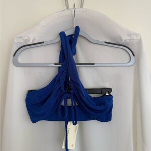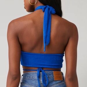 This vibrant blue crop top from Peppermayo features a stylish halter neck design, perfect for a chic and trendy look.