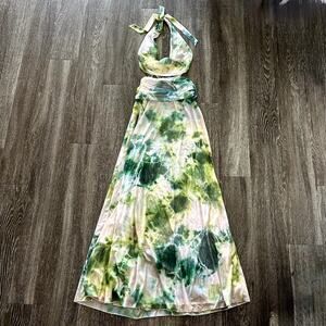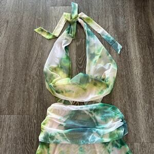 peppermayo maxi dress, Elysia mesh gown, rainforest tie dye dress, sheer halter dress, cowl neck backless dress, vacation outfit, festival dress, party gown