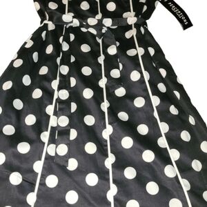 NWT. Lined, sleeveless dress. Black with white polka dots, sash belt. Approximately 17.5" pit to pit, 39" shoulder to hem