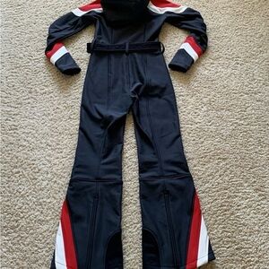 NWT Perfect moment Allos hooded striped ski suit in jet black/red/snow white sz S