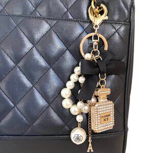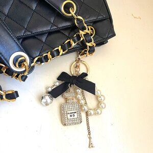 NWT Perfume bottle №5 Rhinestone/Pearls Crystal Bag Charm Pendant Key Ho…