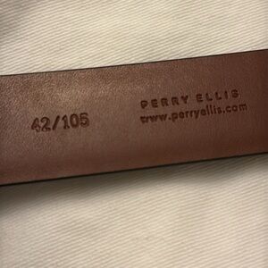 Crafted from rich, dark brown leather, this Perry Ellis belt features a sleek silver-colored rectangular buckle. The smooth leather and detailed stitching along the edges add a touch of sophistication, making it a versatile accessory for any wardrobe.