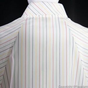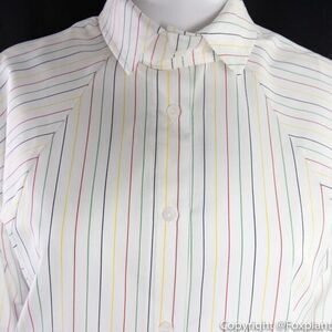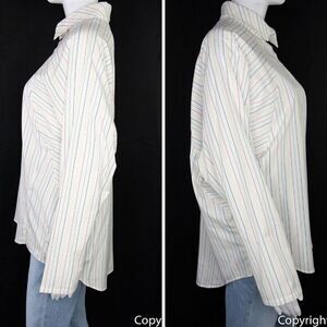 Casual with a bit of flair, this easy-to-wear long sleeve shirt boats a lovely thin striping (purle, blue, red, yellow) on a white field. A light, comfortable linen blend shirt that is stylish with jeans and sneakers or you can dress it up a bit with a skirt and jacket to convert it to business casual.