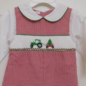 NWT Petit Ami Red Check Smocked Tractor Christmas Tree Wagon Romper sz 12 Months