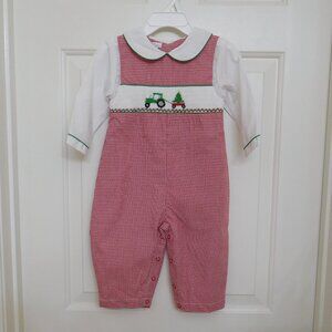 NWT Petit Ami Red Check Smocked Tractor Christmas Tree Wagon Romper sz 24 Months