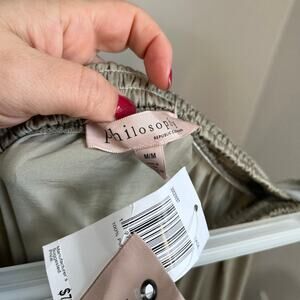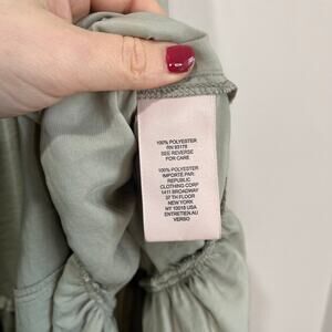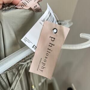 Brand new with tags Philosophy maxi skirt featuring soft tiers, ruffle seams, elastic drawstring waist, and a flowy boho silhouette in a neutral sage green tone.
