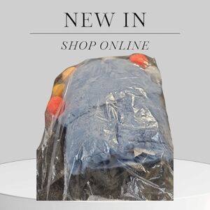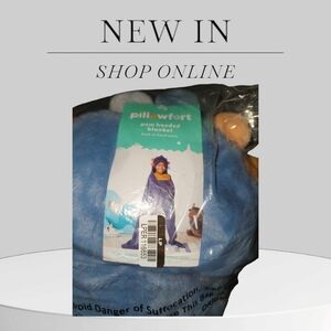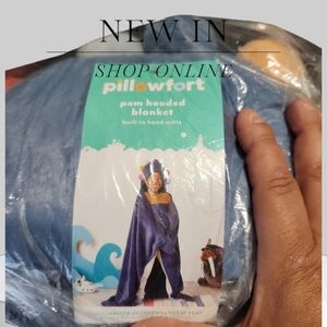 Pillowfort pom hooded blanket with built in hand mitts, 40" x 50" blue, new with tags wrapped in plastic, 100% polyester, please see photos, actual item is as shown.