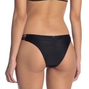 The PilyQ Midnight Gold Braided Zen Teeny Cut Bottom is a not-so-basic teeny cut black bottom featuring a braided strap side with gold bead details.