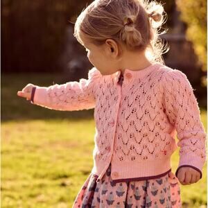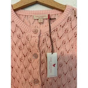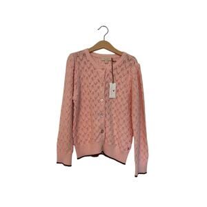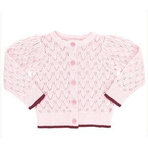 Cozy Cardi! The breezy pointelle stitch on our light pink Constance Sweater offers just the right amount of coverage on a cool Spring day. Gathered puff shoulders.