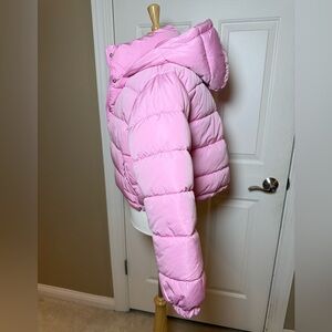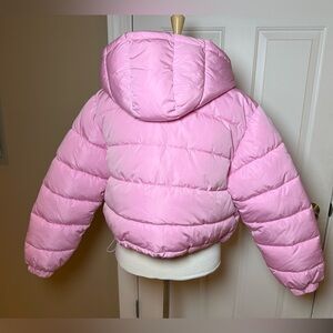 Keep yourself warm and stylish with this cozy pink puffer jacket. Perfect for chilly days. This jacket is brand new and still has the tags on it. It is a women’s size medium, and it is a cropped puffer jacket. It’s a beautiful pink collar like a Barbie pink. Unused and in excellent condition. All my items are well cared for and come from a smoke free home.