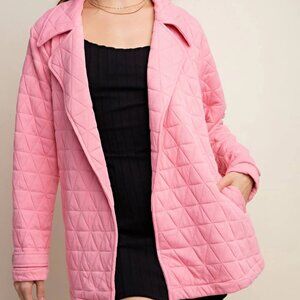 Brand new with tags! This pink quilted jacket, with its tie waist and pockets, is both stylish and functional. Its quilted design adds warmth and comfort, while the tie waist provides a flattering silhouette. The pockets offer convenience and storage for your essentials. Perfect for the fashion-forward and practical woman.
