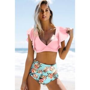 NWT Pink Ruffle Shoulder Top Floral Printed High Waist Bottom Bikini - Large