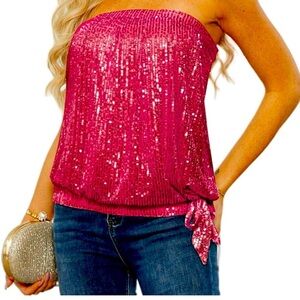 This strapless tube top features an allover sequin design with a flattering side tie detail, creating a fun, eye-catching look. Perfect for nights out, parties, concerts, festivals, or styled with high-rise pants or skirts for a bold statement outfit.