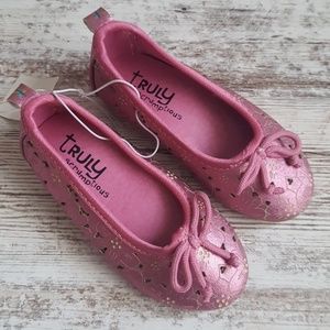 Truly Scrumptious pink shimmer metallic ballet flats with cream white design, cute bow & laser cut outs. Flexible rubber sole.