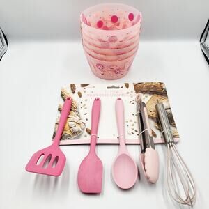 NWT Pink Silicone 5-piece Utensil Set & 6 Set of Cowgirl Print Plastic Bowls