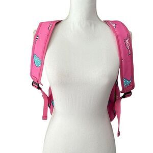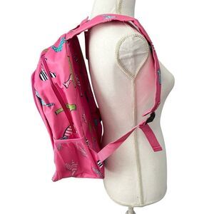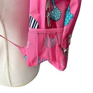 Has two drink bottle pockets on the side. Super cute and roomy! Inside is lined.