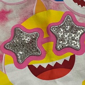 Adorable Pinkfong Baby Shark tank and short set with a pink tie-dye design. Features playful shark graphics with sequin shimmering eyes that really pop on the top and shark graphic on shorts. NWT no holes tears, rips discoloration or missing sequence perfect. Never worn ready to go a good round cute fun vacation, warm weather playtime, fun piece for any little girl or adventurous boy.
