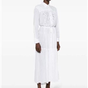BEAUTIFUL WHITE LONG SLEEVE LONG day DRESS WITH DETAIL ON THE CHEST. STUNNING BUTTONS. PULL THE STRINGS AT THE WAIST AND TIE A BOW AT EACH SIDE. Limited addition dress. Last dress available for purchase all across the web. Gorgeous white shirt dress New with tags and still in it's original packaging and box. This PINKO maxi shirt dress features cotton poplin texture, broderie-anglaise detailing, gathered detailing, a panelled design, and pleat detailing. The bodice features eyelet embroidery. It has a classic piont collar, long sleeves with press-stud fastening cuffs, a drawstring fastening waist, front press-stud fastening and front button clousures, a long length, and a flared hem. It is unlined. Only one more left! Almost gone! Best offer yet, other sites are selling it for almost double the price. Message me with your offer because it wont be available soon!