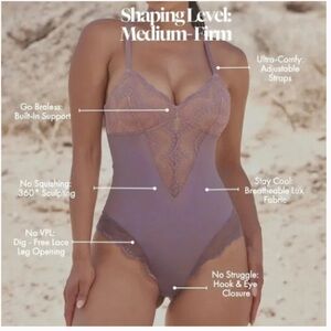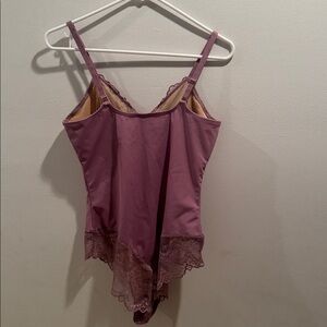 Elegant purple bodysuit with lace details. Perfect for a stylish look.
