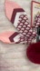 Adorable bag charm key chain by Piper K featuring two maroon-colored fluffy pom-poms resembling cherries, a green faux-leather leaf accent, and a patterned scarf, all attached to a gold-tone lobster clasp.