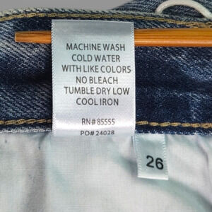 ● This carefree style comes in a classic medium blue wash and features distressing on the right knee, whiskering, and fading details.