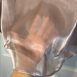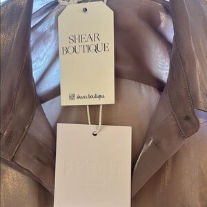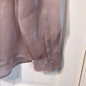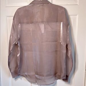 NWT Elegant shimmer of organza blouse with long sleeves. Features button cuffs and a classic collar. Front pockets add style. Wear as a blouse or add something special and wear as an oversized topper. Retail $138