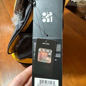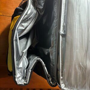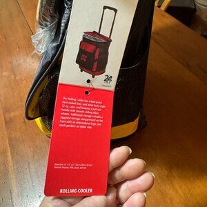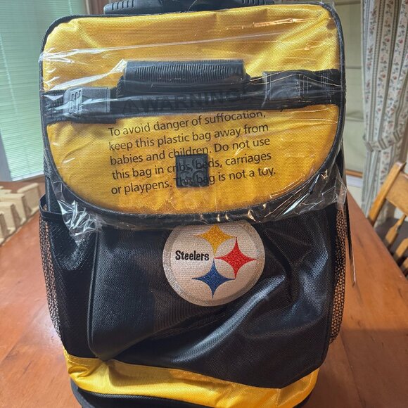 This is a brand new with tags Pittsburgh Steelers rolling cooler from our personal collection, wonderful for football tailgating. Never used. It has a leak-proof, heat-sealed liner that holds 48 12-ounce cans. Two double in-line wheels and a pull-out handle, with a zippered storage pocket in the front with an embroidered Steeler's logo. One mesh pocket on either side. 14x11x21. NFL tag as well as Logo tag. Steeler's colors - black, gold and white. Ask any questions!