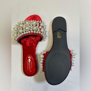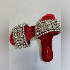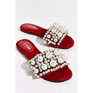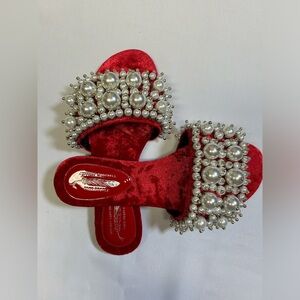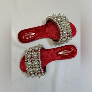 So luxe and femme, these statement velvet slides features dramatic pearl accents on the top of the foot.