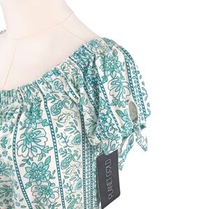 NWT Planet Gold Green Striped Boho Blouse Floral Off Shoulder Tie Sleeve Top S
