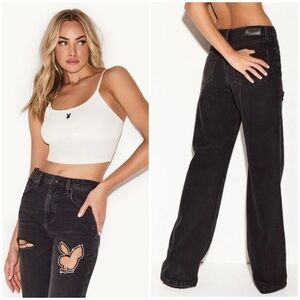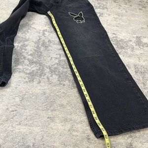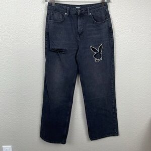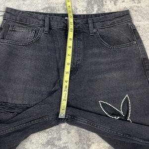 Rhinestone Bunny Cutout Playboy Denim Jeans Size 29. Zipper and Button closure, high rise, black playboy patch, distressed. Washed black/ charcoal gray color. Designed in USA. 100% cotton.