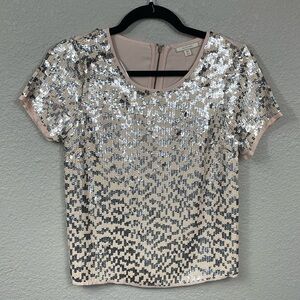NWT Pleione Sequin Sparkle Short Sleeve Blouse Top Party Pink Silver Sz XSP