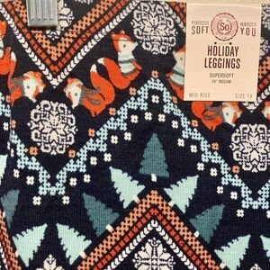 SO brand. Size 1X. Perfectly soft Christmas mid rise leggings. Has an elastic waistband. The perfect holiday style. These juniors SO leggings are an absolute essential. The design is zigzag with foxes, pine trees, and snowflakes. Still have tags attached. Background zigzag color most closely matches “Midnight Blue” Crayola crayon and black. Made of 95% polyester and 5% spandex. From a pet friendly home.