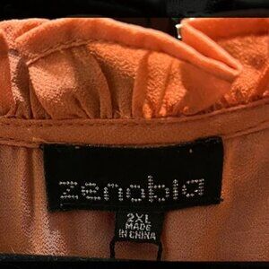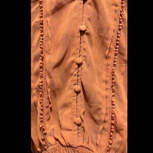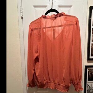 Beautiful rust orange blouse with delicate ruffle detailing and fabric-covered buttons. Features an elastic smocked hem and cuffs for a flattering fit. Lightweight, semi-sheer material, perfect for casual or dressy occasions. Brand new with tags; care instructions: hand wash cold, flat dry. Size: 2X
