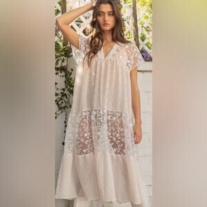 NWT Pol Bohemian Retro Lace Sheer Panel Embroidered Short Sleeve Dress White Med