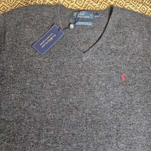 Polo Ralph Lauren Men's 100% Lambswool Italian Yarn V Neck Sweater Size XXL, Color is Heather Gray, Logo Red Pony.