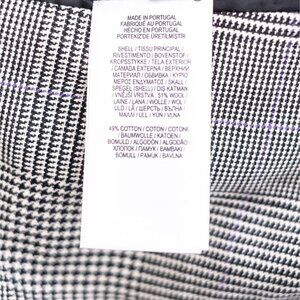 * Shell: wool, cotton. Body lining: polyester. Sleeve lining: viscose, acetate.