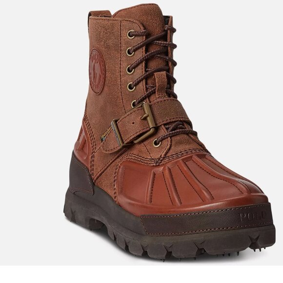 Crafted from tumbled leather and waxed suede, Polo Ralph Lauren's Oslo Boot offers a modern interpretation of the classic duck boot, with a buckled strap and a rubber lug sole. Designed for lightweight comfort, this higher version features HydroGuard® at the interior to help keep your feet dry.
