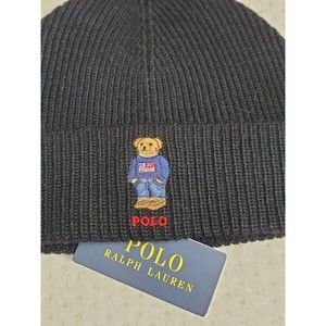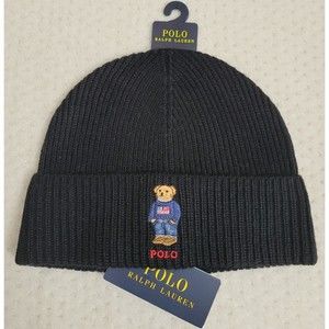 This rib knit beanie is embroidered at the cuff with Ralph Lauren's Polo Bear in a flag sweater with jeans! Seamed crown Fold over cuff Polo Bear and "Polo" embroidered at the cuff Acrylic/Wool/nylon