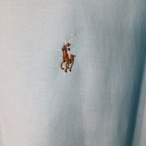 Classic PRL Slim Fit Stretch Oxford-crisp and comfortable. Aegean Blue with the iconic flesh/Tan pony at chest. Button-down collar, full button front, barrel cuffs, curved hem. Cotton with a touch of elastane for flex.