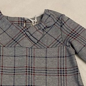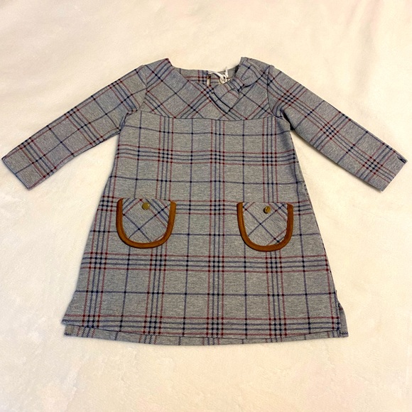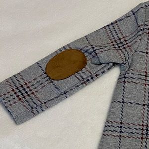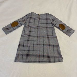 Hope and Henry baby girls gray riding dress. Now detail at neck, faux suede elbow pads, and faux suede trimmed front pockets with gold button.