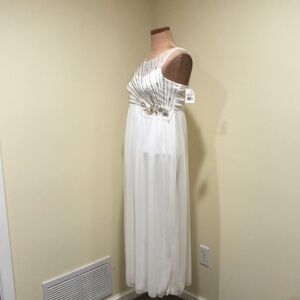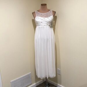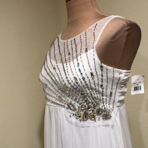 New with tag. There is a slight flaw in the mesh neckline that is not too noticeable unless inspecting closely. Sleeveless, scoop neck with mesh overlay, empire waist babydoll silhouette dress. Zips in back. Stretchy material. It is a Big Girls 16 but could also fit Women’s XS. Ivory with aurora borealis rhinestones.