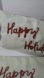 A tweed style woven but soft front in a cream color with tiny red specs. Embroidered Happy Holidays in Deep Red wine color almost burgundy but not. Zip bottom closure. Pillow Insert NOT included. (16"x26")