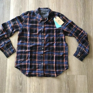 Elevate your wardrobe with this stunning NWT PrAna Golden Canyon Flannel Snap Front Shirt in Rich Sapphire, a perfect addition to your casual outfit. The plaid pattern with multicolor hues and button accents gives it a timeless look that you can wear during all seasons.
