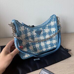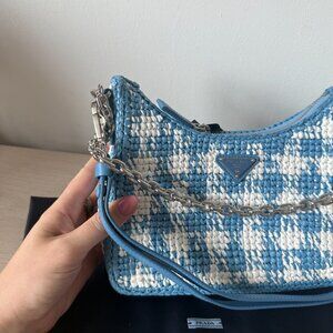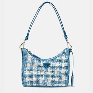 NWT Prada Re-Edition Mini Shoulder Bag Celeste Raffia Gingham Pattern Chain