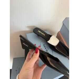 NWT Prada Slip-on Mules Black Patent Leather Square Toe Triangular Kitten Heels